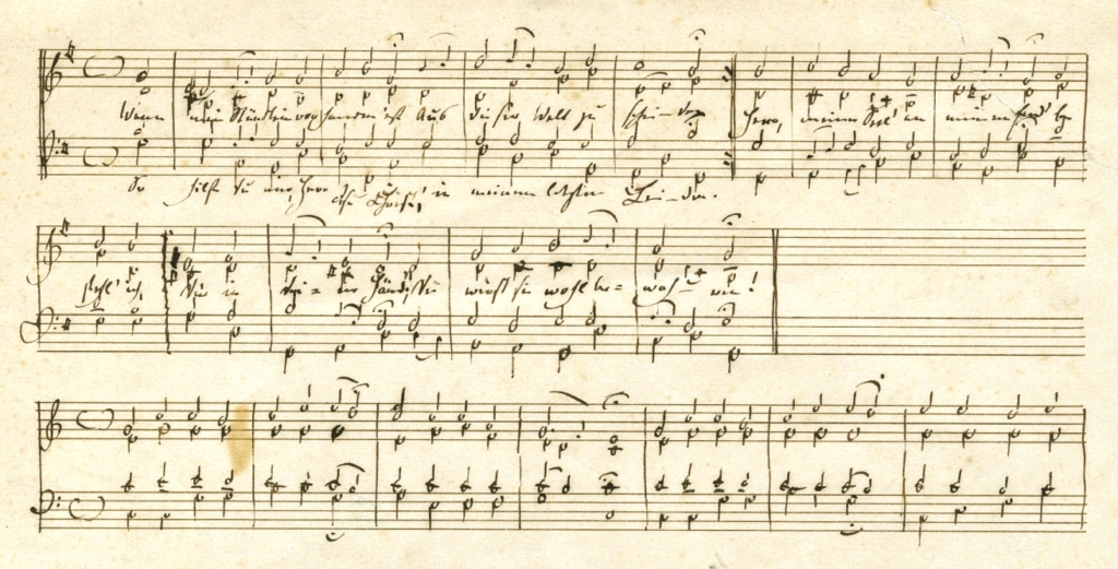 Het oorspronkelijke handschrift van de twee koraalzettingen kwam in 1938 uit de nalatenschap van Robert Schumanns jongste dochter Eugenie in het Robert-Schumann-Haus te Zwickau. Het autograaf was daar een van de kostbaarste tentoonstellingsobjecten en werd — partieel — ook wel als illustratie in boeken gebruikt.7 Het betreft een blad met notenbalken in zestien systemen, waarvan slechts de bovenste zes zijn beschreven. In het zevende en achtste systeem zijn wel sleutels aangebracht, maar geen noten meer genoteerd.